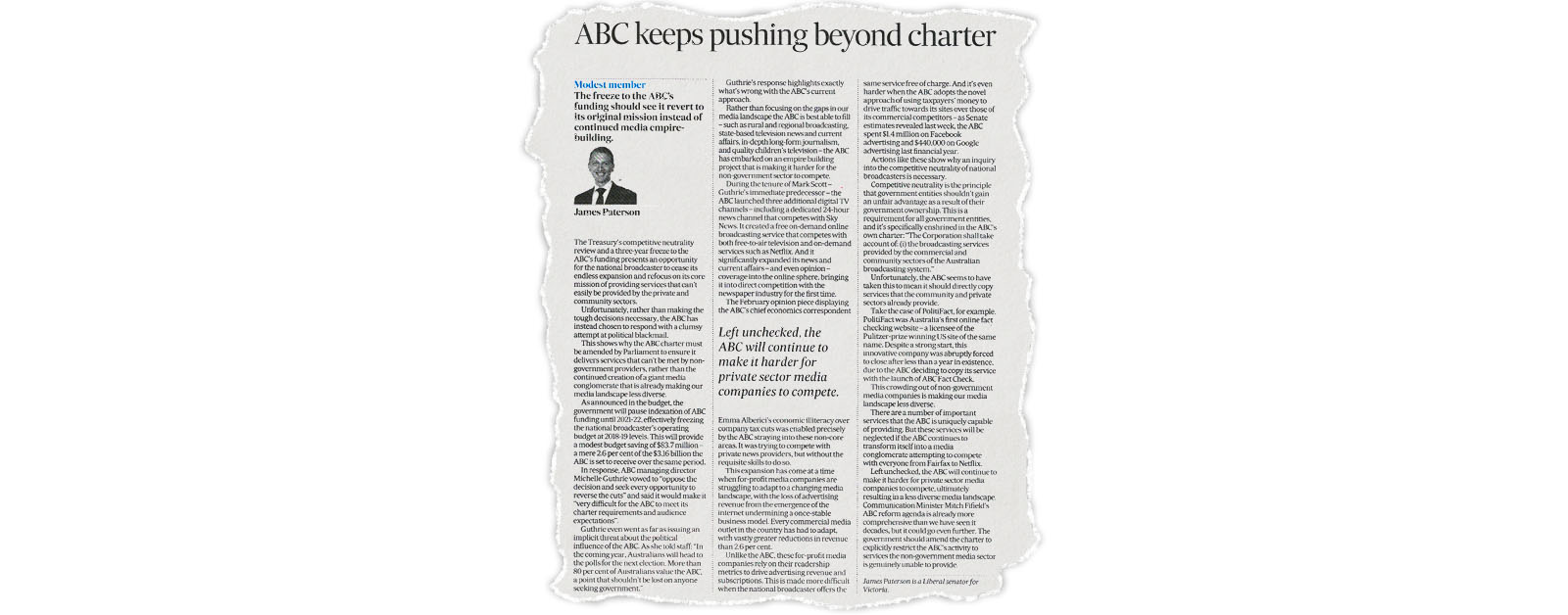 Ms Guthrie even went as far as issuing an implicit threat about the political influence of the ABC. As she told staff: "In the coming year, Australians will head to the polls for the next election. More than 80 per cent of Australians value the ABC, a point that shouldn't be lost on anyone seeking government."Guthrie's response highlights exactly what's wrong with the ABC's current approach.Rather than focusing on the gaps in our media landscape that the ABC is best able to fill – areas such as rural and regional broadcasting, state-based television news and current affairs, in-depth long-form journalism, and quality children's television – the ABC has embarked on an empire building project that is making it harder for the non-government sector to compete.During the tenure of Mark Scott – Ms Guthrie's immediate predecessor – the ABC launched three additional digital TV channels – including a dedicated 24-hour news channel that competes with Sky News. It created a free on-demand online broadcasting service that competes with both free-to-air television and on-demand services such as Netflix. And it significantly expanded its news and current affairs – and even opinion – coverage into the online sphere, bringing it into direct competition with the newspaper industry for the first time.The February opinion piece displaying ABC's chief economics correspondent Emma Alberici's economic illiteracy over company tax cuts, was enabled precisely by the ABC straying into these non-core areas. It was trying to compete with private news providers, but without the requisite skills to do so.Non-government companies getting crowded out