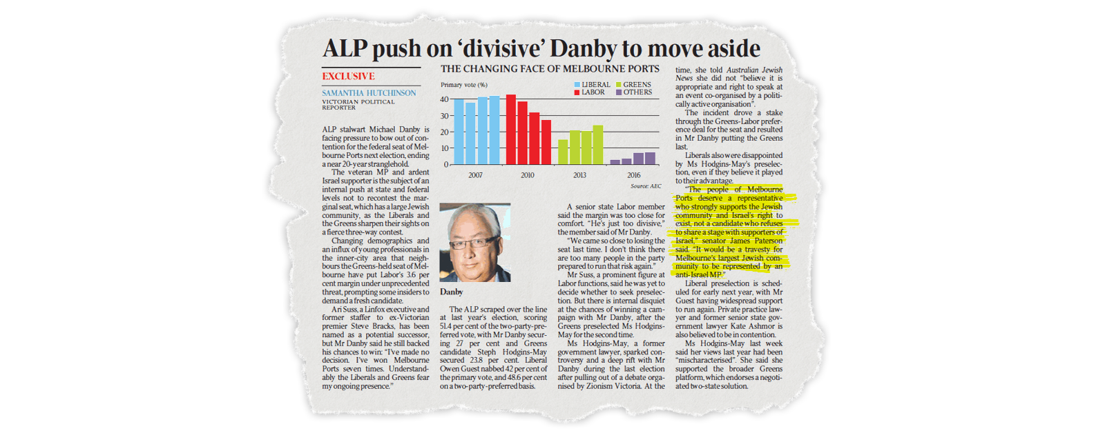 ALP stalwart Michael Danby is facing pressure to bow out of contention for the federal seat of Melbourne Ports next election, ending a near-20-year stranglehold.The veteran MP and ardent Israel supporter is the subject of an internal push at state and federal levels not to recontest the marginal seat, which has a large Jewish community, as the Liberals and the Greens sharpen their view on a fierce three-way contest.Changing demographics and an influx of young professionals in the inner-city area that neighbours the Greens-held seat of Melbourne have put Labor’s 3.6 per cent margin under unprecedented threat, prompting some insiders to demand a fresh candidate.Ari Suss, a Linfox executive and former staffer to ex-Victorian premier Steve Bracks, has been widely named as a potential successor, but Mr Danby said he still backed his chances to win. “I’ve made no decision. I’ve won Melbourne Ports seven times. Understandably the Liberals and Greens fear my ongoing presence. That’s good,” he told The Australian.The ALP scraped over the line at the last, scoring 51.4 per cent of the two-party-preferred vote, with Mr Danby secured 27 per cent and Greens candidate Steph Hodgins-May secured 23.8 per cent.Liberal Owen Guest nabbed 42 per cent of the primary vote, and 48.6 per cent on a two-party-preferred basis.A senior state Labor member said the margin was too close for comfort. “He’s just too divisive,” the member said of Mr Danby. “We came so close to losing the seat last time. I don’t think there are too many people in the party prepared to run that risk again.”Mr Suss, a prominent figure at Labor Party functions, said he was yet to decide whether to seek preselection.But inside the party, there is disquiet at the chances of winning a campaign with Mr Danby in place, after the Greens preselected Ms Hodgins-May for the second time.Ms Hodgins-May, a former government lawyer, sparked controversy and a deep rift with Mr Danby during the last election after pulling out of a debate organised by Zionism Victoria. At the time, she told Australian Jewish News she did not “believe it is appropriate and right to speak at an event co-organised by a politically active organisation”.The incident drove a stake through the Greens-Labor preference deal for the seat and saw Mr Danby hand out how-to-vote cards putting the Greens last.Liberals also were disappointed by Ms Hodgins-May’s preselection, even if they believe it played to their advantage.“The people of Melbourne Ports deserve a representative who strongly supports the Jewish community and Israel’s right to exist, not a candidate who refuses to share a stage with supporters of Israel,” senator James Paterson told The Australian. “It would be a travesty for Melbourne’s largest Jewish community to be represented by an anti-Israel MP.”Liberal preselection is scheduled for early next year, with Mr Guest having widespread support to run again. Private practice lawyer and former senior state government lawyer Kate Ashmor is also believed to be in contention.Last week Ms Hodgins-May told The Australian her views last year had been “mischaracterised”. She says she supports the broader Greens platform, which endorses a negotiated two-state solution and, contrary to the NSW Greens, does not support the Boycott, Divestment and Sanctions campaign.This article originally appeared in The Australian.