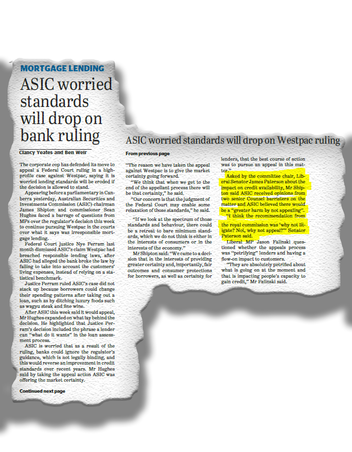 "Our concern is that the judgment of the Federal Court may enable some relaxation of those standards," he said."If we look at the spectrum of those standards and behaviour, there could be a retreat to bare minimum standards, which we do not think is either in the interests of consumers or in the interests of the economy."Mr Shipton said: "We came to a decision that in the interests of providing greater certainty and, importantly, fair outcomes and consumer protections for borrowers, as well as certainty for lenders, that the best course of action was to pursue an appeal in this matter."Asked by the committee chair, Liberal Senator James Paterson about the impact on credit availability, Mr Shipton said ASIC received opinions from two senior Counsel barristers on the matter and ASIC believed there would be a "greater harm by not appealing"."I think the recommendation from the royal commission was ‘why not litigate? Not, why not appeal?’” Senator Paterson said.
