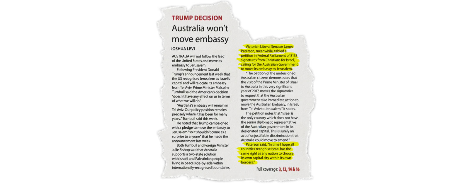 Australia will not follow the lead of the United States and move its embassy to Jerusalem.Following President Donald Trump’s announcement last week that the US recognises Jerusalem as Israel’s capital and will relocate its embassy from Tel Aviv, Prime Minister Malcolm Turnbull said that America’s decision “doesn’t have any effect on us in terms of what we will do”.“Australia’s embassy will remain in Tel Aviv. Our policy position remains precisely where it has been for many years,” Turnbull said this week.He noted that Trump campaigned with a pledge to move the embassy to Jerusalem “so it shouldn’t come as a surprise to anyone” that he made the announcement last week.Both Turnbull and Australia’s Foreign Minister Julie Bishop said that Australia support a two-state solution with Israeli and Palestinian people living in peace side-by-side within internationally-recognised boundaries.Victorian Liberal Senator James Paterson, meanwhile, tabled a petition in Federal Parliament of 8133 signatures from Christians for Israel, which called for the Australian Government to move its embassy to Jerusalem.“The petition of the undersigned Australian citizens demonstrates that the visit of the Prime Minister of Israel to Australia in this very significant year of 2017, moves the signatories to request that the Australian government take immediate action to move the Australian Embassy, in Israel, from Tel Aviv to Jerusalem,” it states.The petition notes that “Israel is the only country which does not have the senior diplomatic representative of the Australian government in its designated capital”.“This is surely an act of unjustifiable discrimination that Australia could move to amend.”Paterson said he is delighted to see growing recognition that Jerusalem is Israel’s capital and should be recognised by the international community.“In time I hope all countries recognise Israel has the same right as any nation to choose its own capital city within its own borders,” he said.This article originally appeared in the Australian Jewish News.