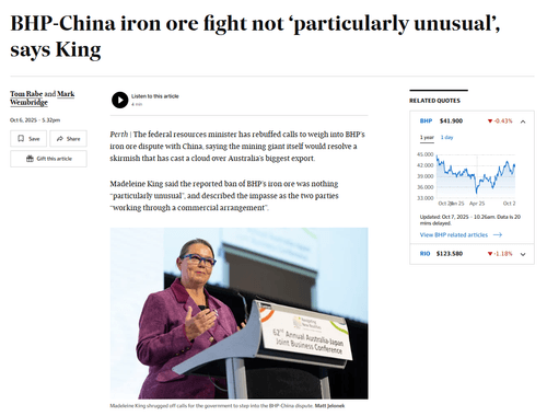 BHP has refused to confirm or deny the blockade’s existence, or comment on the scuffle. Data from tracking websites shows that BHP vessels continue to ship ore from Port Hedland to hubs in China, although cargo ships can be re-routed to alternative destinations mid-transit.