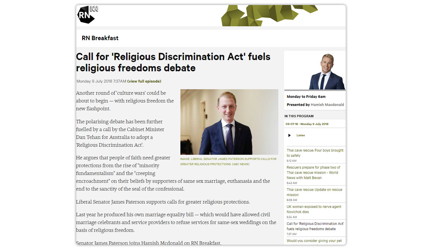 Another round of 'culture wars' could be about to begin — with religious freedom the new flashpoint.The polarising debate has been further fuelled by a call by the Cabinet Minister Dan Tehan for Australia to adopt a 'Religious Discrimination Act'.He argues that people of faith need greater protections from the rise of "minority fundamentalism" and the "creeping encroachment" on their beliefs by supporters of same sex marriage, euthanasia and the end to the sanctity of the seal of the confessional.Liberal Senator James Paterson supports calls for greater religious protections.Last year he produced his own marriage equality bill — which would have allowed civil marriage celebrants and service providers to refuse services for same-sex weddings on the basis of religious freedom.Senator James Paterson joins Hamish Mcdonald on RN Breakfast.This piece originally appeared on the ABC RN website, along full RN Breakfast interview