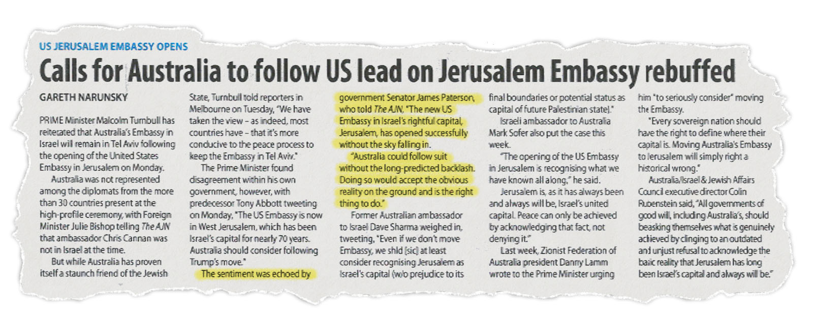 PRIME Minister Malcolm Turnbull has reiterated that Australia’s Embassy in Israel will remain in Tel Aviv following the opening of the United States Embassy in Jerusalem on Monday.Australia was not represented among the diplomats from the more than 30 countries present at the high-profile ceremony, with Foreign Minister Julie Bishop telling The AJN that ambassador Chris Cannan was not in Israel at the time.But while Australia has proven itself a staunch friend of the Jewish State, Turnbull told reporters in Melbourne on Tuesday, “We have taken the view – as indeed, most countries have – that it’s more conducive to the peace process to keep the Embassy in Tel Aviv.”The Prime Minister found disagreement within his own government, however, with predecessor Tony Abbott tweeting on Monday, “The US Embassy is now in West Jerusalem, which has been Israel’s capital for nearly 70 years. Australia should consider following Trump’s move.”The sentiment was echoed by government Senator James Paterson, who told The AJN, “The new US Embassy in Israel’s rightful capital, Jerusalem, has opened successfully without the sky falling in.“Australia could follow suit without the long-predicted backlash. Doing so would accept the obvious reality on the ground and is the right thing to do.”Former Australian ambassador to Israel Dave Sharma weighed in, tweeting, “Even if we don’t move Embassy, we shld [sic] at least consider recognising Jerusalem as Israel’s capital (w/o prejudice to its final boundaries or potential status as capital of future Palestinian state).”Israeli ambassador to Australia Mark Sofer also put the case this week.“The opening of the US Embassy in Jerusalem is recognising what we have known all along,” he said.Jerusalem is, as it has always been and always will be, Israel’s united capital. Peace can only be achieved by acknowledging that fact, not denying it.”Last week, Zionist Federation of Australia president Danny Lamm wrote to the Prime Minister urging him “to seriously consider” moving the Embassy.“Every sovereign nation should have the right to define where their capital is. Moving Australia’s Embassy to Jerusalem will simply right a historical wrong.”Australia/Israel & Jewish Affairs Council executive director Colin Rubenstein said, “All governments of good will, including Australia’s, should be asking themselves what is genuinely achieved by clinging to an outdated and unjust refusal to acknowledge the basic reality that Jerusalem has long been Israel’s capital and always will be.”This article was originally published in the Australian Jewish News.