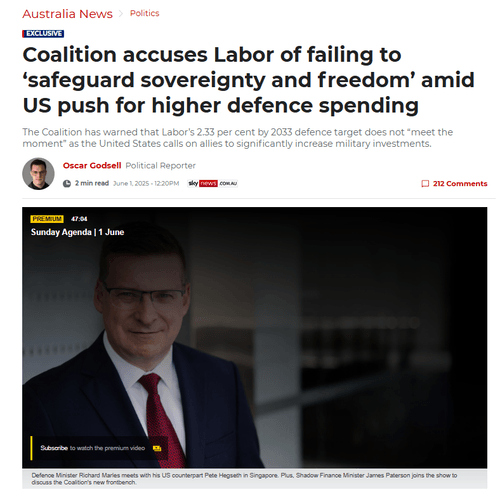 Shadow finance minister James Paterson has accused the Albanese government of failing to protect Australia’s sovereignty and freedom amid pressure to increase military spending.
