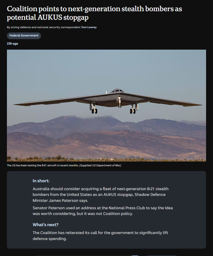 Australia has not operated a bomber since the F-111 was retired in 2010, and the 2023 Defence Strategic Review recommended against Australia considering the B-21 Raider.