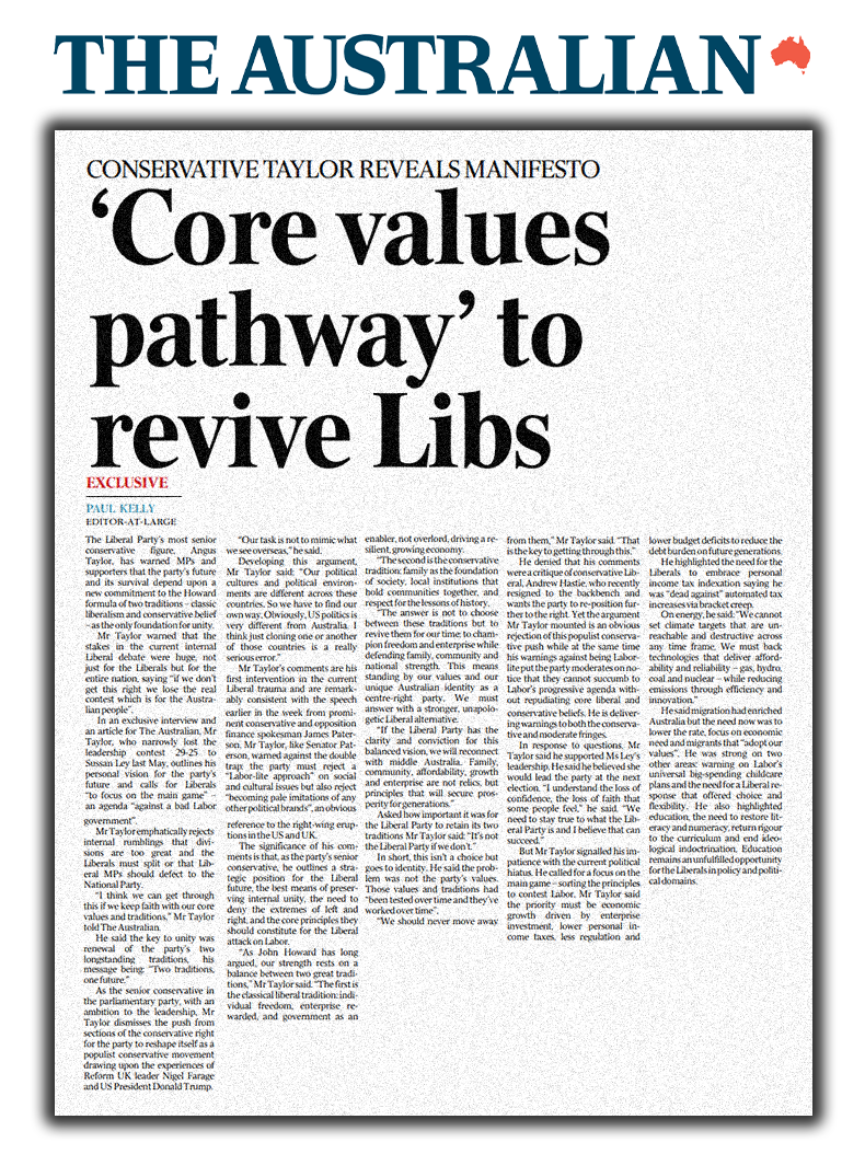 “As John Howard has long argued, our strength rests on a balance between two great traditions,” Mr Taylor said. “The first is the classical liberal tradition: individual freedom, enterprise rewarded, and government as an enabler, not overlord, driving a resilient, growing economy.