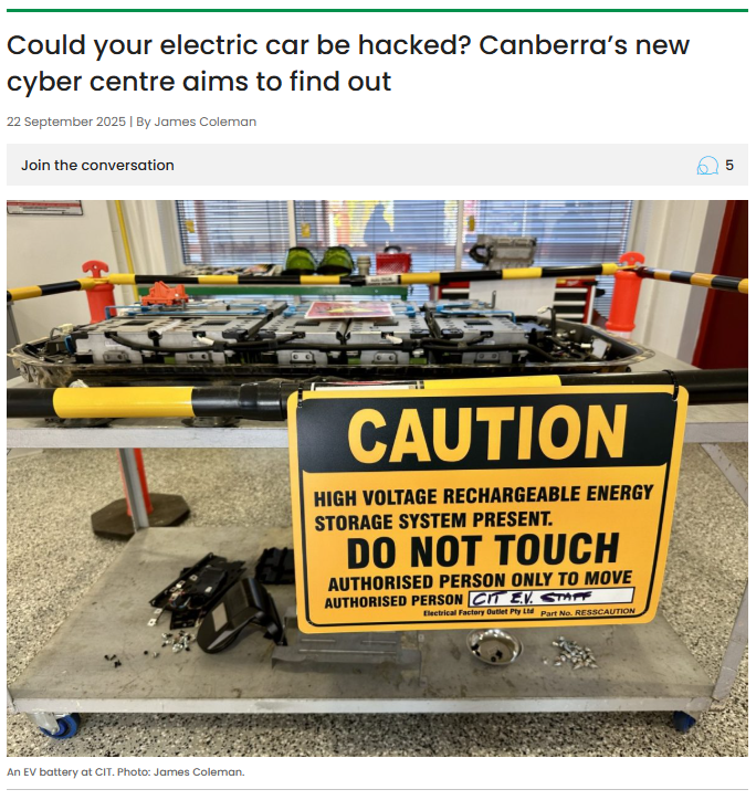 The centre, launched this week at CIT Woden by Federal Skills Minister Andrew Giles and ACT counterpart Michael Pettersson, will train students in cyber defence, data protection and supply chain security – but it will also work alongside CIT’s existing Electric Vehicle Centre of Excellence to examine cyber risks in cars.