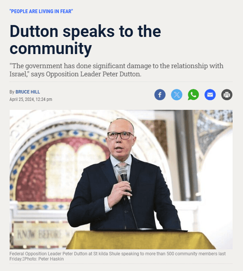 “I must say the community’s reception to Mr Dutton’s visit was incredible. He spoke powerfully about the evils of antisemitism and Australia’s need to support Israel as one of its most important allies,” he said.