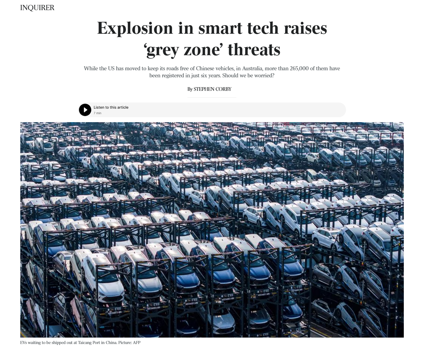 “The proliferation of ‘smart technology’ in our daily lives – from our mobile phones and smart TVs, through to the increasing numbers of Chinese-manufactured electric and combustion vehicles with integrated ‘smart systems’ – (exposes) the length and breadth of the Australian economy and everyday lives to potential risk and coercion at an unprecedented level.”