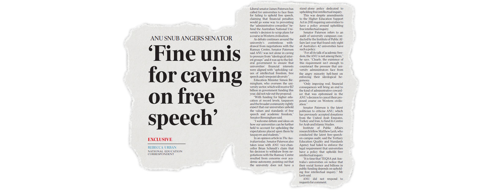 Liberal senator James Paterson has called for universities to face fines for failing to uphold free speech, claiming that financial penalties would go some way to preventing the “administrative cowardice” behind the Australian National University’s decision to scrap plans for a course in Western civilisation.As debate continues around the university’s contentious withdrawal from negotiations with the Ramsay Centre, Senator Paterson said ANU was not alone in caving to pressure from “ideological interest groups” and it was up to the federal government to ensure that universities’ financial interests were aligned with “upholding values of intellectual freedom, free speech and viewpoint diversity”.Education Minister Simon Birmingham, who oversees the university sector, which will receive $17 billion in government funding this year, did not rule out the proposal.“With funding for higher education at record levels, taxpayers and the broader community rightly expect that our universities uphold the values and standards of free speech and academic freedom,” Senator Birmingham said.“I welcome debate and ideas on how our universities can be further held to account for upholding the expectations placed upon them by taxpayers and students.”In an opinion article in The Australian today, Senator Paterson also takes issue with ANU vice-chancellor Brian Schmidt’s claim that his decision to withdraw from negotiations with the Ramsay Centre resulted from concerns over academic autonomy, pointing out that the university does not have a stand-alone policy dedicated to upholding free intellectual inquiry.This was despite amendments to the Higher Education Support Act in 2011 requiring universities to have a policy around upholding free intellectual inquiry.Senator Paterson refers to an audit of university campuses conducted by the Institute of Public Affairs last year that found only eight of Australia’s 42 universities have such a policy.“ For all its talk of academic freedom, the ANU is not among them,’’ he says. “Clearly, the existence of this requirement isn’t enough to counteract the pressure that university administrators face from the angry minority hell-bent on enforcing their ideological hegemony.“Only imposing real, financial consequences will bring an end to the kind of administrative cowardice that was epitomised in the ANU’s decision to cancel their proposed course on Western civilisation.”Senator Paterson is the latest politician to criticise ANU, which has previously accepted donations from the United Arab Emirates, Turkey and Iran, to fund its Centre for Arab and Islamic Studies.Institute of Public Affairs research fellow Matthew Lesh, who conducted the latest free-speech-on-campus audit, said the Tertiary Education Quality and Standards Agency had failed to enforce the legal requirement that universities have a policy that upholds free intellectual inquiry.“It is time that TEQSA put Australia’s universities on notice that their social licence and billions in public funding depends on upholding free intellectual inquiry,” Mr Lesh said.ANU did not respond to requests for comment.