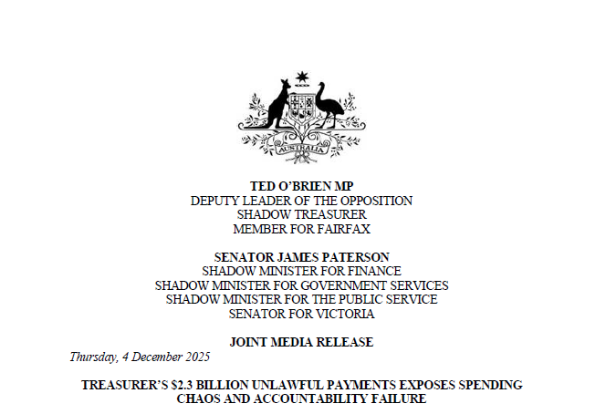 The Federal Opposition today said the revelation of $2.3 billion in unlawful payments in breach of section 83 of the Constitution is no simple error — it is a blank cheque culture inside a Government that has lost control of spending, debt and basic financial discipline.