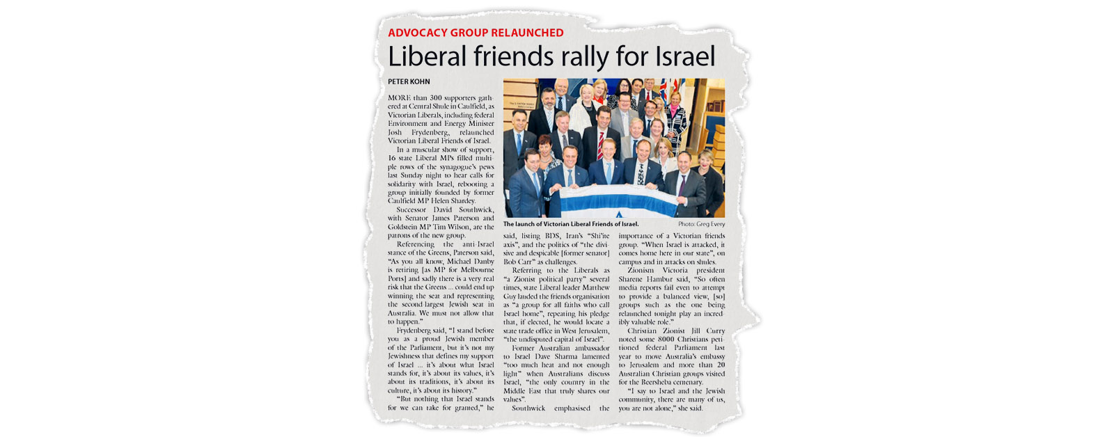 MORE than 300 supporters gathered at Central Shule in Caulfield, as Victorian Liberals, including federal Environment and Energy Minister Josh Frydenberg, relaunched Victorian Liberal Friends of Israel.In a muscular show of support, 16 state Liberal MPs filled multiple rows of the synagogue’s pews last Sunday night to hear calls for solidarity with Israel, rebooting a group initially founded by former Caulfield MP Helen Shardey.Successor David Southwick, with Senator James Paterson and Goldstein MP Tim Wilson, are the patrons of the new group.Referencing the anti-Israel stance of the Greens, Paterson said, “As you all know, Michael Danby is retiring [as MP for Melbourne Ports] and sadly there is a very real risk that the Greens … could end up winning the seat and representing the second-largest Jewish seat in Australia. We must not allow that to happen.”Frydenberg said, “I stand before you as a proud Jewish member of the Parliament, but it’s not my Jewishness that defines my support of Israel … it’s about what Israel stands for, it’s about its values, it’s about its traditions, it’s about its culture, it’s about its history.”“But nothing that Israel stands for we can take for granted,” he said, listing BDS, Iran’s “Shi’ite axis”, and the politics of “the divisive and despicable [former senator] Bob Carr” as challenges.Referring to the Liberals as “a Zionist political party” several times, state Liberal leader Matthew Guy lauded the friends organisation as “a group for all faiths who call Israel home”, repeating his pledge that, if elected, he would locate a state trade office in West Jerusalem, “the undisputed capital of Israel”.Former Australian ambassador to Israel Dave Sharma lamented “too much heat and not enough light” when Australians discuss Israel, “the only country in the Middle East that truly shares our values”.Southwick emphasised the importance of a Victorian friends group. “When Israel is attacked, it comes home here in our state”, on campus and in attacks on shules.Zionism Victoria president Sharene Hambur said, “So often media reports fail even to attempt to provide a balanced view, [so] groups such as the one being relaunched tonight play an incredibly valuable role.”Christian Zionist Jill Curry noted some 8000 Christians petitioned federal Parliament last year to move Australia’s embassy to Jerusalem and more than 20 Australian Christian groups visited for the Beersheba centenary.“I say to Israel and the Jewish community, there are many of us, you are not alone,” she said.This article was originally published in the Australian Jewish News.
