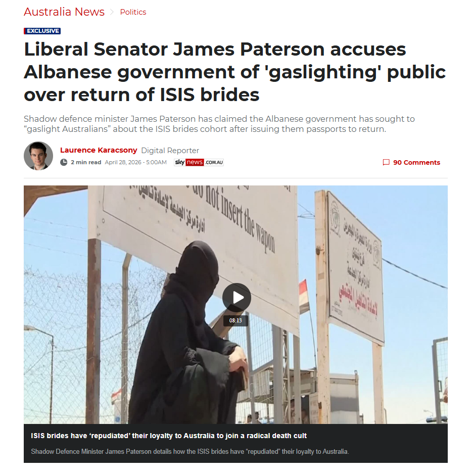 Shadow defence minister James Paterson has claimed the Albanese government has sought to “gaslight Australians” about the ISIS brides cohort after issuing them passports to return.
