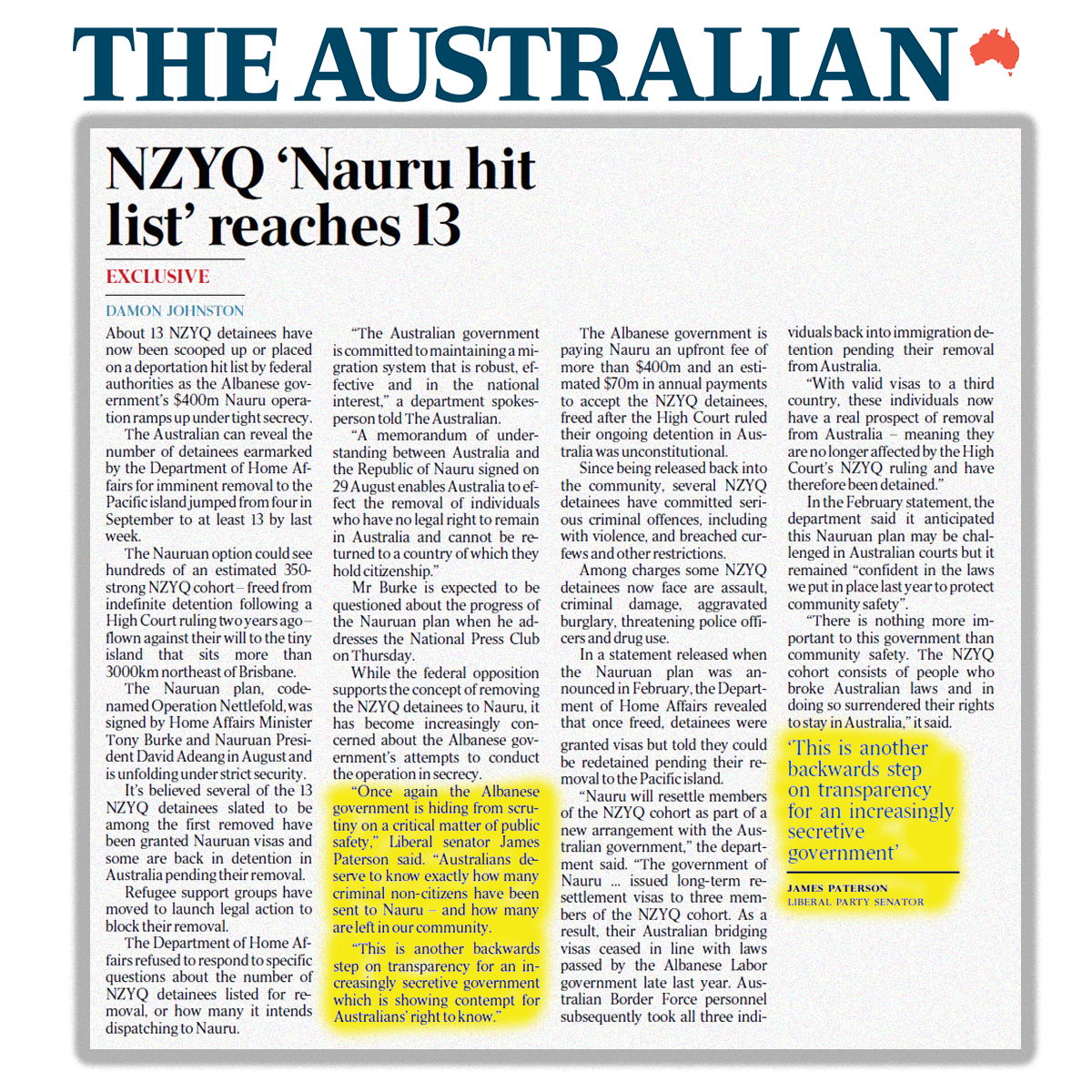 “Once again the Albanese government is hiding from scrutiny on a critical matter of public safety,” Liberal senator James Paterson said. “Australians deserve to know exactly how many criminal non-citizens have been sent to Nauru – and how many are left in our community.