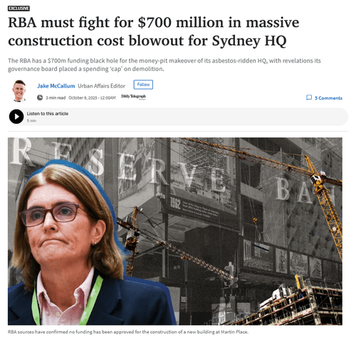 RBA sources confirmed no funding has been approved for the construction of a new building at Martin Place, or the fit out of workspaces, as RBA Governor Michele Bullock conceding last months she had “low confidence” construction costs wouldn’t surpass the $1.2 billion forecasts.