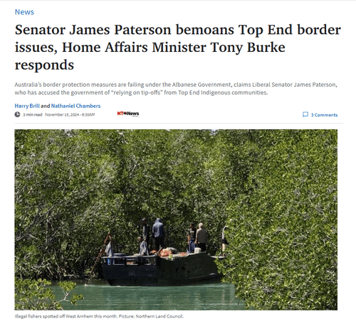 Australia’s border protection measures are failing under the Albanese Government, claims Liberal Senator James Paterson, who has accused the government of “relying on tip-offs” from Top End Indigenous communities.
