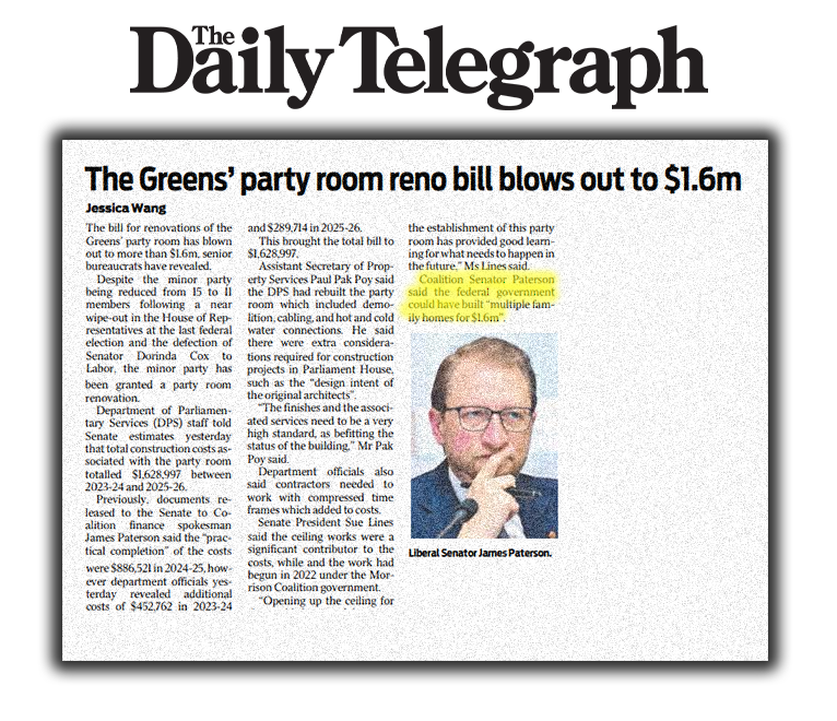 Department of Parliamentary Services (DPS) staff told Senate estimates yesterday that total construction costs associated with the party room totalled $1,628,997 between 2023-24 and 2025-26.
