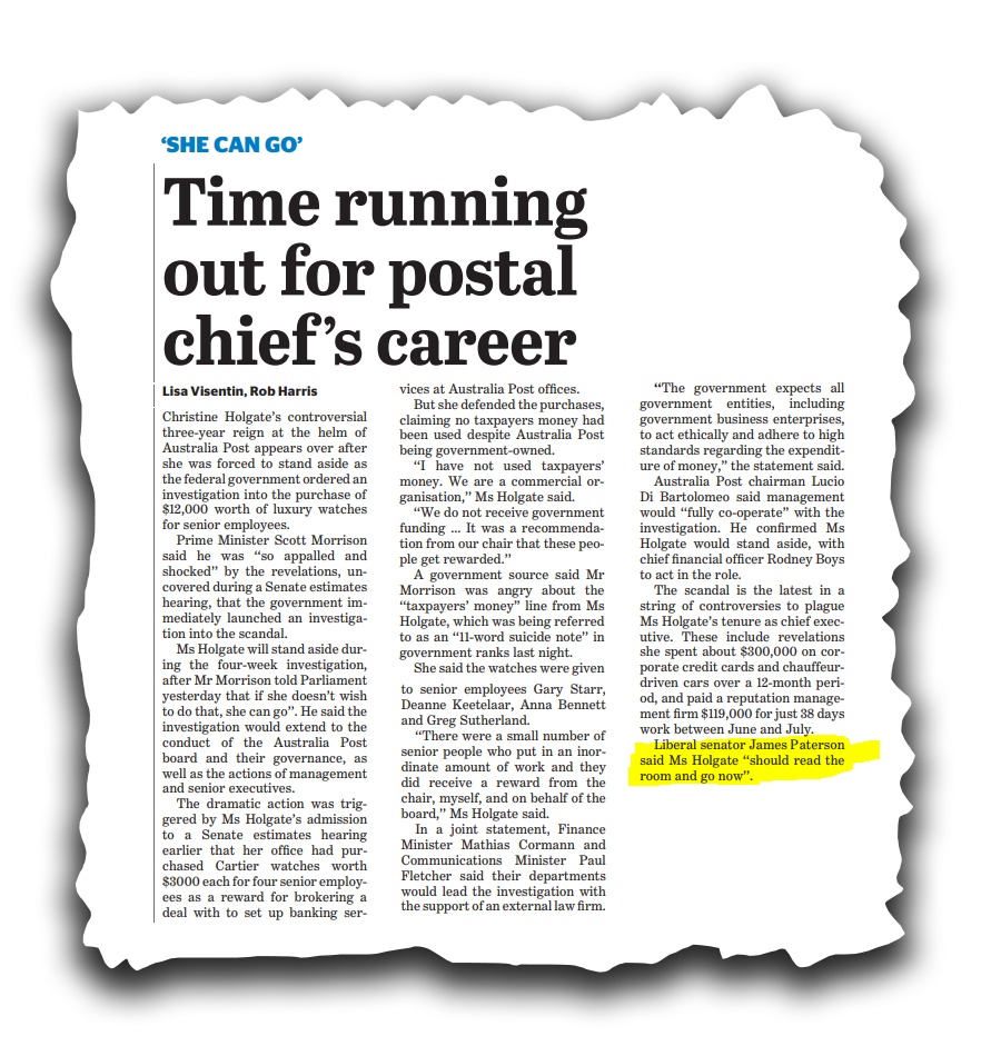 The Australia Post CEO's career appears to be over as the government investigates the $12,000 purchase of four Cartier watches given to senior staffers.Christine Holgate's controversial three-year reign at the helm of Australia Post appears over after she was forced to stand aside as the federal government ordered an investigation into the purchase of $12,000 worth of luxury watches for senior employees.Prime Minister Scott Morrison said he was "so appalled and shocked" by the revelations, uncovered during a Senate estimates hearing, that the government immediately launched an investigation into the scandal.Ms Holgate will stand aside during the four-week investigation, after Mr Morrison told Parliament yesterday that if she doesn't wish to do that, she can go".He said the investigation would extend to the conduct of the Australia Post board and their governance, as well as the actions of management and senior executives.The dramatic action was triggered by Ms Holgate's admission to a Senate estimates hearing earlier that her office had purchased Cartier watches worth $3000 each for four senior employees as a reward for brokering a deal with to set up banking services at Australia Post offices.But she defended the purchases, claiming no taxpayers money had been used despite Australia Post being government-owned."I have not used taxpayers' money. We are a commercial organisation," Ms Holgate said."We do not receive government funding ... It was a recommendation from our chair that these people get rewarded."A government source said Mr Morrison was angry about the "taxpayers' money" line from Ms Holgate, which was being referred to as an "11-word suicide note" in government ranks last night.She said the watches were given to senior employees Gary Starr, Deanne Keetelaar, Anna Bennett and Greg Sutherland."There were a small number of senior people who put in an inordinate amount of work and they did receive a reward from the chair, myself, and on behalf of the board," Ms Holgate said.In a joint statement, Finance Minister Mathias Cormann and Communications Minister Paul Fletcher said their departments would lead the investigation with the support of an external law firm."The government expects all government entities, including government business enterprises, to act ethically and adhere to high standards regarding the expenditure of money," the statement said.Australia Post chairman Lucio Di Bartolomeo said management would "fully co-operate" with the investigation.He confirmed Ms Holgate would stand aside, with chief financial officer Rodney Boys to act in the role.The scandal is the latest in a string of controversies to plague Ms Holgate's tenure as chief executive.These include revelations she spent about $300,000 on corporate credit cards and chauffeurdriven cars over a 12-month period, and paid a reputation management firm $119,000 for just 38 days work between June and July.Liberal senator James Paterson said Ms Holgate "should read the room and go now".
