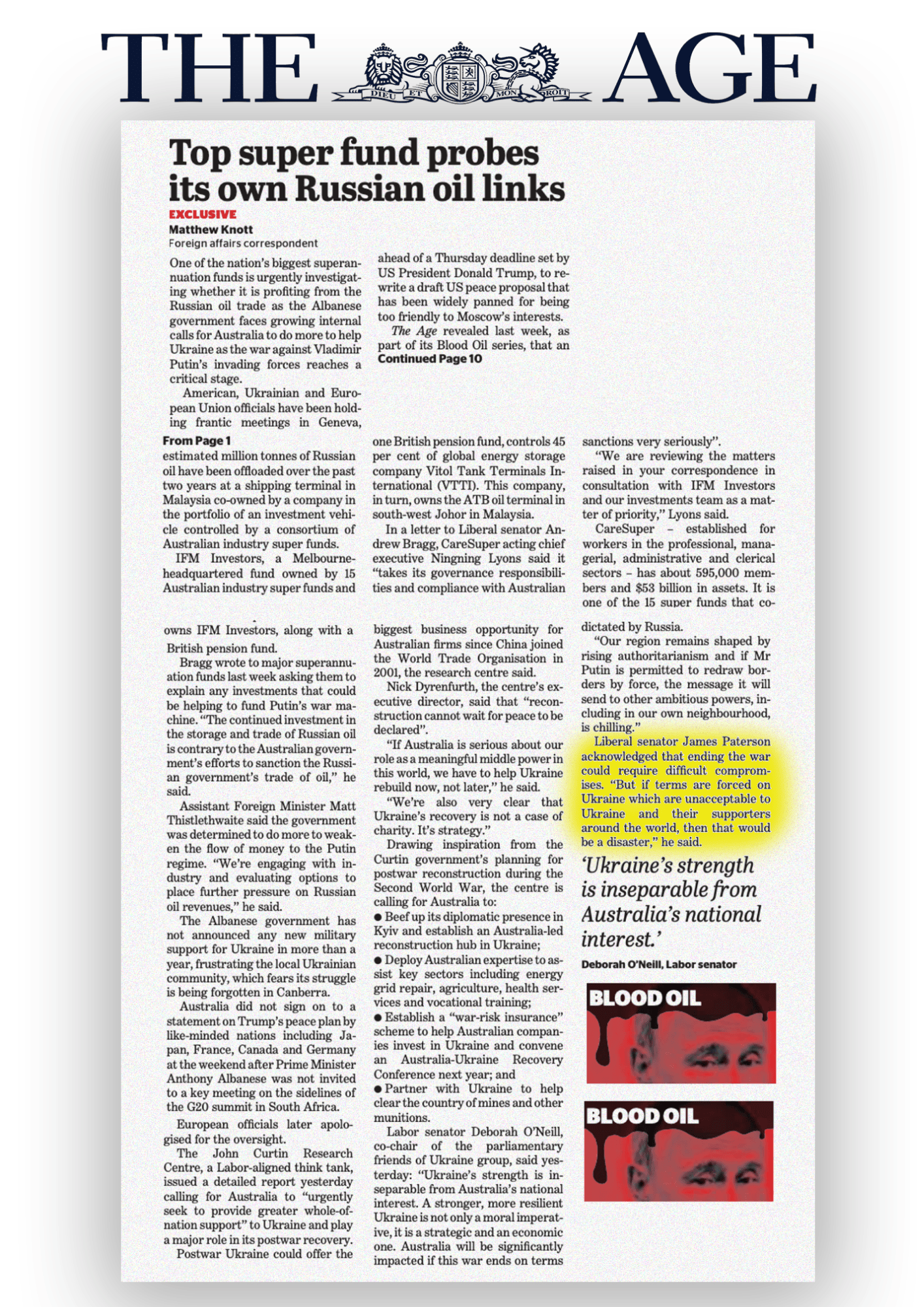 This masthead revealed last week, as part of its Blood Oil series, that an estimated 1 million tonnes of Russian oil have been offloaded over the past two years at a shipping terminal in Malaysia co-owned by a company in the portfolio of an investment vehicle controlled by a consortium of Australian industry super funds.