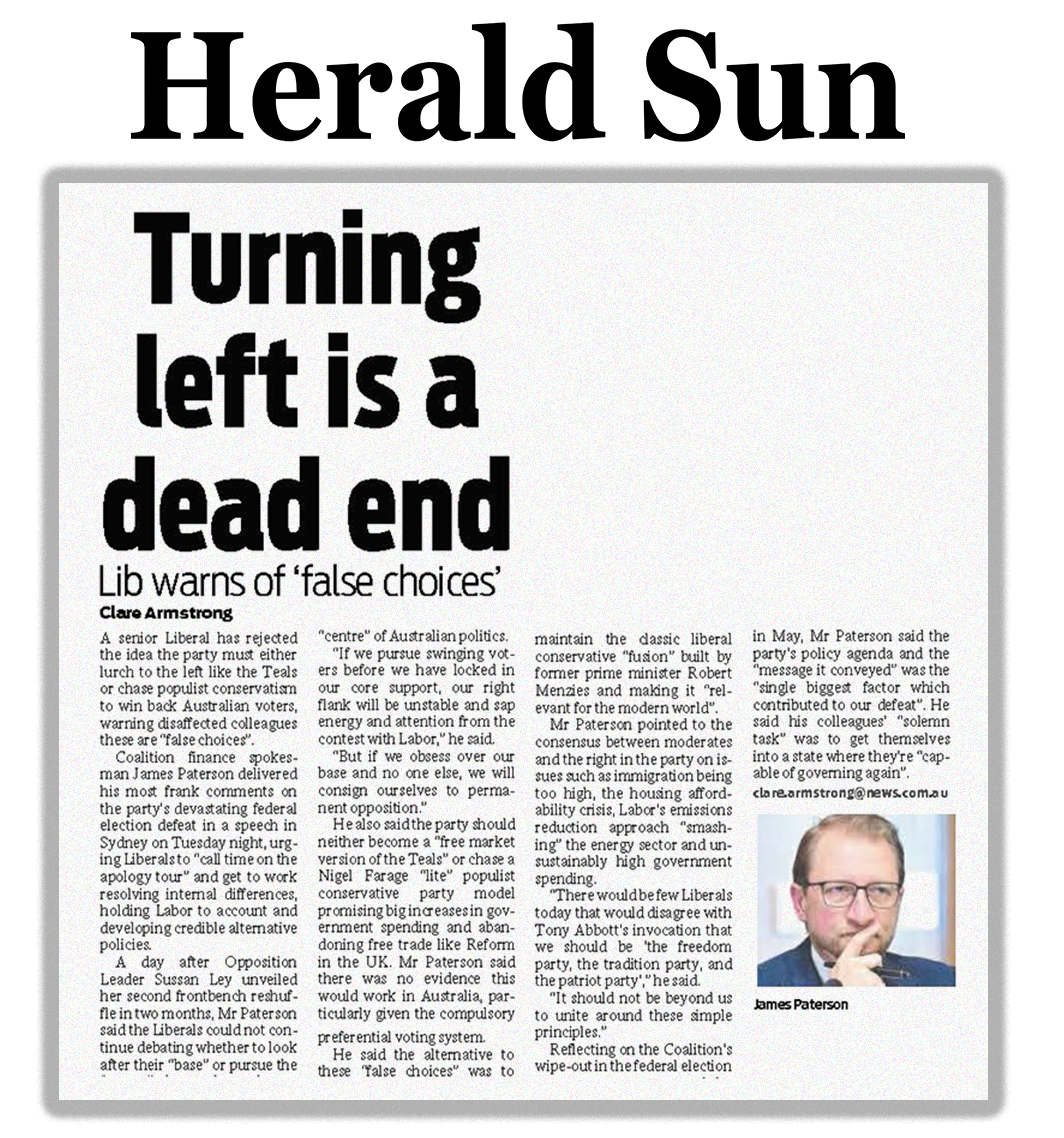 He also said the party should neither become a “free market version of the Teals” or chase a Nigel Farage “lite” populist conservative party model promising significant increases in government spending and abandoning free trade like Reform in the UK.