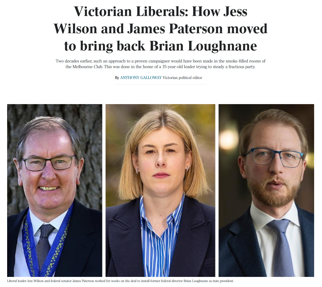 It was Saturday morning, April 11, and the conversation carried consequences well beyond the room. Wilson and Paterson wanted Loughnane, the party’s former federal and state director and one of its most experienced campaign strategists, to take over the state presidency of a division long plagued by internal conflict. Two decades earlier, such an approach would have been made in the smoke-filled rooms of the Melbourne Club, but this was conducted in the home of a 35-year-old leader trying to steady a fractious party, as her young son Patrick’s toys lay scattered on the floor.