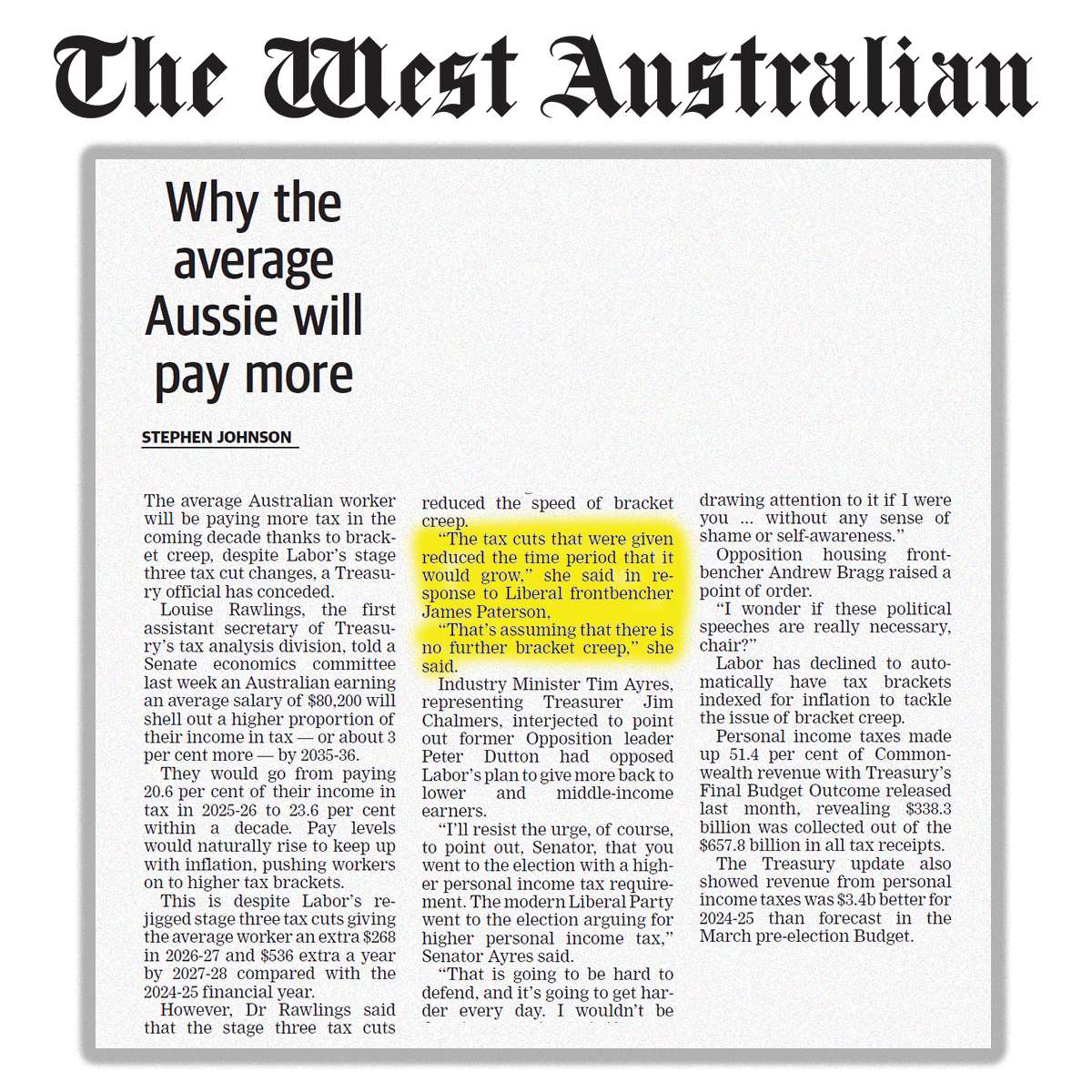 “I’ll resist the urge, of course, to point out, Senator, that you went to the election with a higher personal income tax requirement. The modern Liberal Party went to the election arguing for higher personal income tax,” Senator Ayres said.